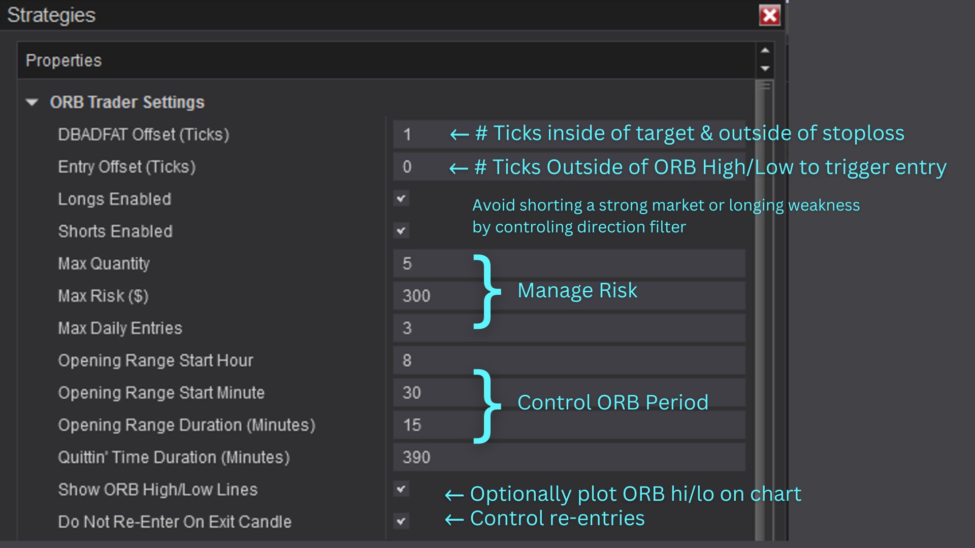 ORBie settings allow control of sensitivity for the entry and exits, control over direction, and my personal favorite: risk management. ORBie will calculate how many contracts/units you can take within a set max risk per trade and limit the number of trades taken. When “Do Not Re-Enter On Exit Candle” is checked, ORBie will wait until the next candle for your data series before considering a re-entry (be sure that the Opening Range Duration is a multiple of your timeframe for this to work).
